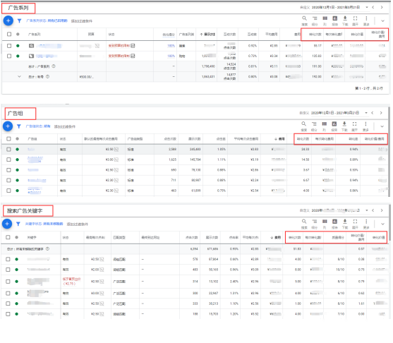 1. 了解賬戶(hù)的轉化是通過(guò)哪些廣告系列,廣告組和關(guān)鍵字,通過(guò)分析一段時(shí)間內賬戶(hù)的轉化次數,每次轉化費用和轉化價(jià)值等數據,可以針對賬戶(hù)的各個(gè)層級有依據的進(jìn)行優(yōu)化調整。
