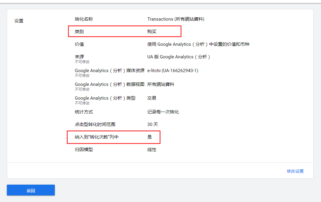還是拿這個(gè)賬戶(hù)舉例,用戶(hù)購買(mǎi)是我們的最終目標,所以我們只把購買(mǎi)這一項設置進(jìn)轉化次數列中。